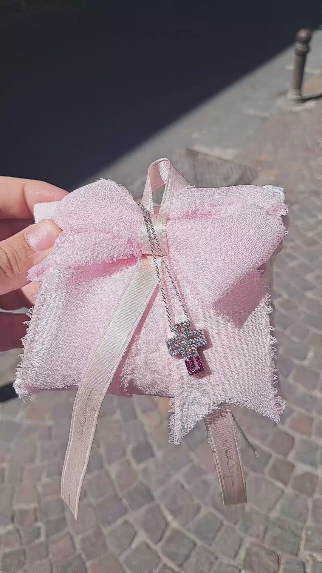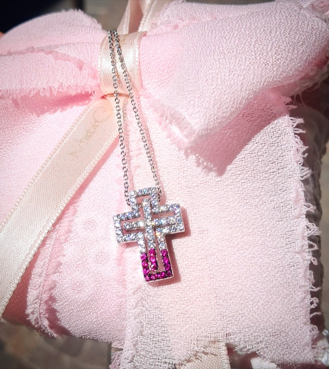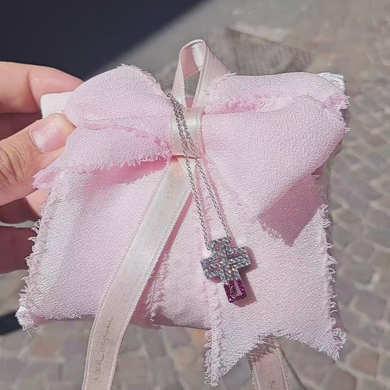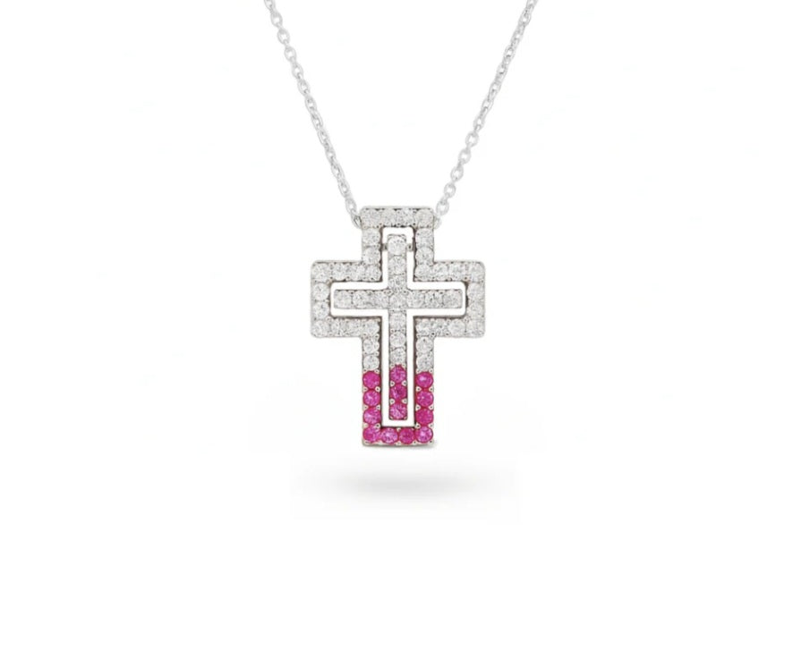 Collana in argento 925 placcata oro bianco 18kt con zirconi bianchi e rosa, modello scatola. Altezza croce 2cm. Lunghezza catenina totale 60 cm