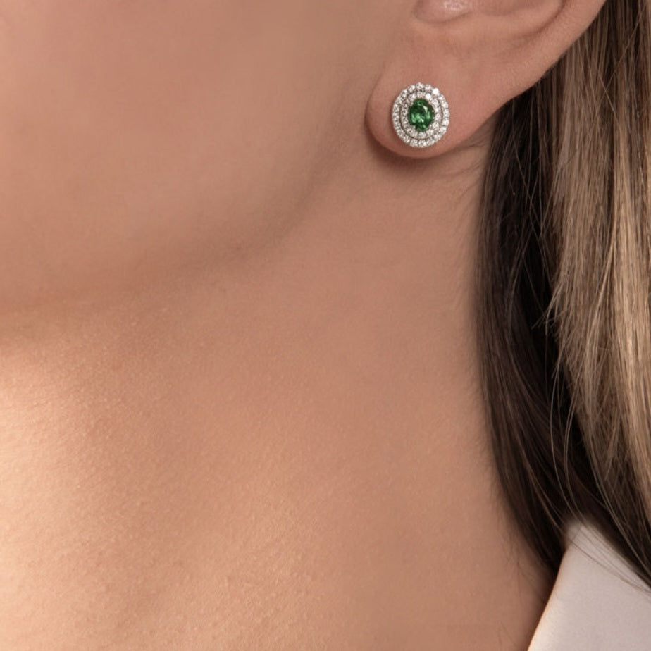 Orecchini in argento 925 placcati oro bianco 18kt con pietra colorata centrale e doppio contorno. Per te che ami gli orecchini piccoli ,ma , che non vuoi passare inosservata