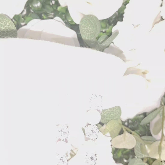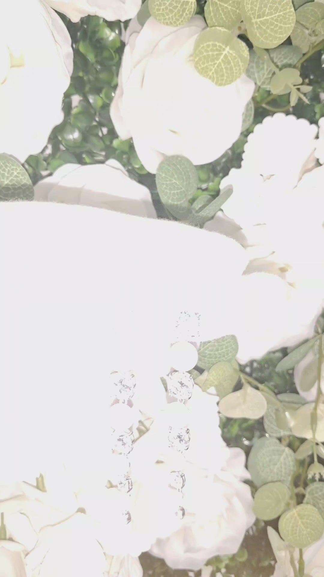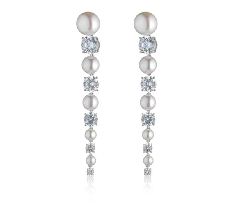 Orecchini in argento 925 placcati oro bianco 18kt con zirconi cubic super luminosi e perle sintetiche di grandezza a scalare da 12 a 3 mm . Lunghezza orecchino 8cm